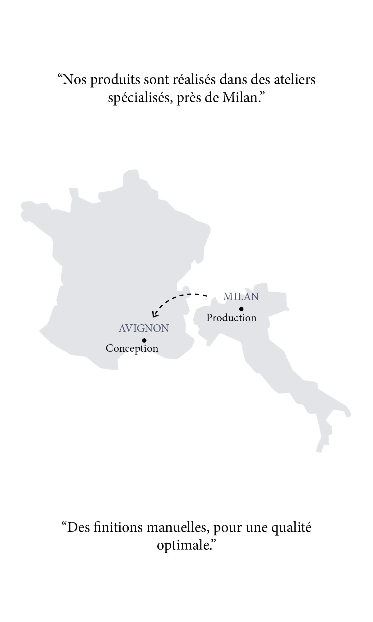 Ils sont conçus par nos soins à Avignon, en Provence et sont fabriqués près de Milan, dans des ateliers sélectionnés pour leur savoir-faire.