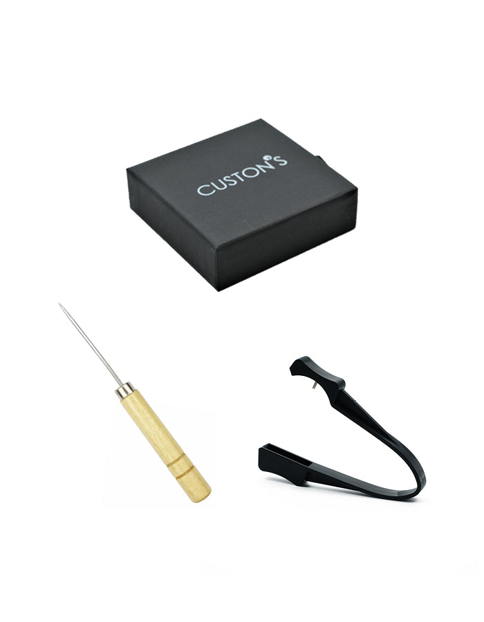 The tweezers and punch are included with any Custon's order. To activate this offer, you must click on the Gift icon and select them by checking the corresponding boxes.